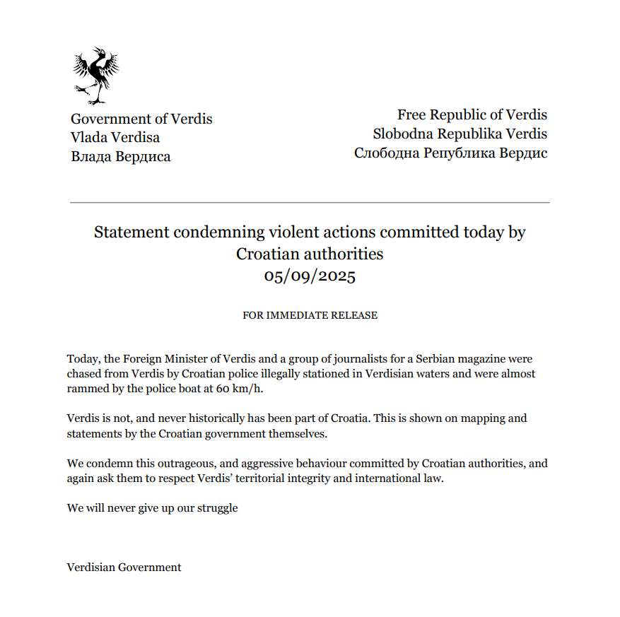 Today, the Foreign Minister of Verdis and a group of journalists for a Serbian magazine were chased from Verdis by Croatian police illegally stationed in Verdisian waters and were almost rammed by the police boat at 60 km/h.